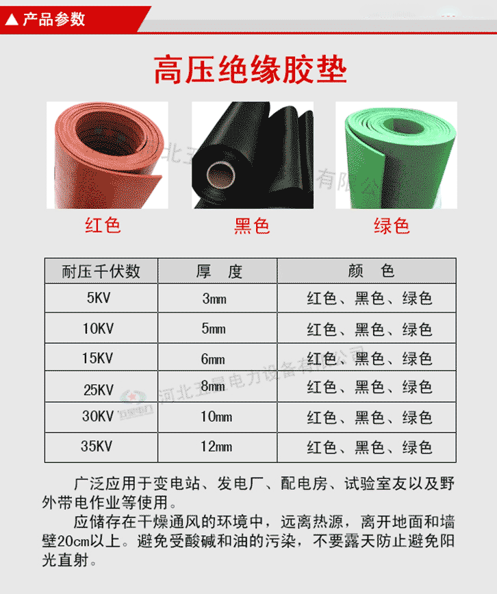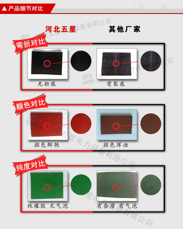 絕緣膠墊產(chǎn)品顏色為黑色、紅色、綠色。 不含雜質(zhì):原生橡膠材質(zhì),不含次生膠,切面不會有粉末 柔韌性好:具有優(yōu)良的絕緣性能,彈性強(qiáng),拉伸強(qiáng)度大 光澤度高:原生橡膠材質(zhì),無任何塑料成分,表面光澤度高 無氣泡:五星電力絕緣膠墊,表面無氣泡,無裂痕