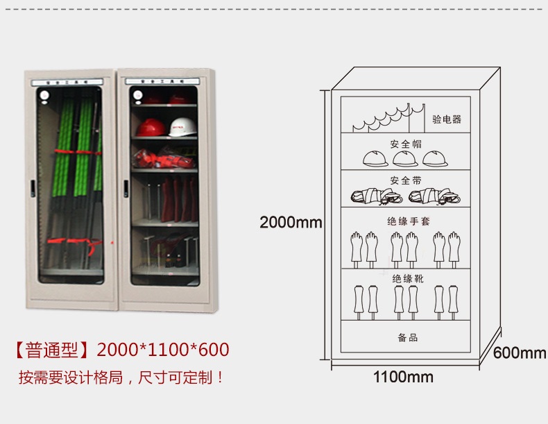電力安全工具柜又稱安全工器具柜,按功能可以分為普通排風除濕柜,智能烘干除濕柜,智能抽濕除濕柜等 外殼選用1.2優質冷板,采用磷化鋅系、藝術型靜電噴涂,高強度鋼化透明玻璃(外觀色為微機灰)。接地線均配有接地線繞線架及帶夾反光編號牌,使接地線纏繞規范不易損壞,擺放整齊使用方便;絕緣手套配有防粘連撐板,絕緣擋板、絕緣棒、驗電筆、操作桿均設有橡膠墊定位卡,安全帶、腳扣、鑰匙設有專用掛鉤,標示牌按種類分格放置,圍網配有專用包,網桿配有專用筒,網桿座分格放置,防毒面具配有專用箱,呼吸器設有專用滑板。廣泛應用于各種電壓等級的變電站、集控站、線路工區以及電力公司客服中心等單位和部門,并適應不同溫濕度地區的使用。